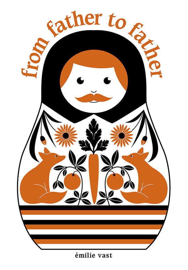 Father couldn’t be father if weren’t for his father and fathers before him. In this wonderful little book, from Father to Father, a father tells his son about his family of fathers from his great-great-grandfather to his own birth. This long line of fathers is celebrated each with their own nesting doll drawing decorated in bright colors, embellishments, plants and animals in the style of a matryoshka doll, also known as a Russian nesting doll. The final nesting doll drawing is of the little boy who someday may be a father, too. The book was first published in French as De Papa en Papa. Vast also has authored a similar book celebrating the line of mothers entitled from Mother to Mother.