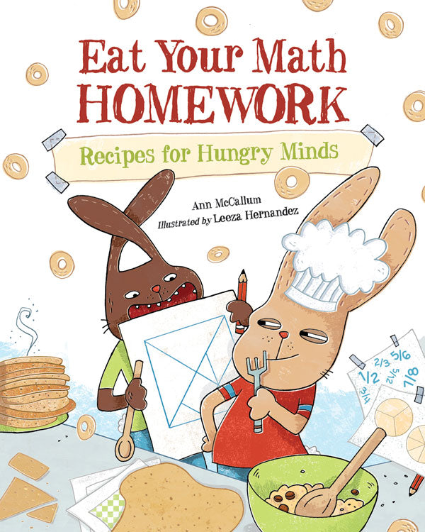 While the supply list and preparation time may preclude these from actually being assigned as homework, kids who are mathematically minded will enjoy snacking and learning their way through the recipes. Well-written and easily followed, the recipes include Fibonacci snack sticks based on the famous sequence of numbers, fraction chips made from cut-up tortillas, tessellating two-color brownies, milk and tangram cookies, variable pizza pi and probability trail mix. McCallum does not shy away from using appropriate vocabulary, defining it both in context and in the glossary at the back. She also includes fascinating historical tidbits that allow readers to see the precursors of today’s math and the mathematicians that first explored them. Hernandez cleverly folds math into her illustrations, too—observant readers will notice the numbers emblazoned somewhere on each character, but only the mathematically informed will figure out their pattern. Her high-energy mixed-media artwork is filled with humorous details, while her cartoon rabbits are likely to remind kids of the Arthur cartoons. Excellent backmatter helps review concepts.
